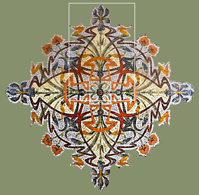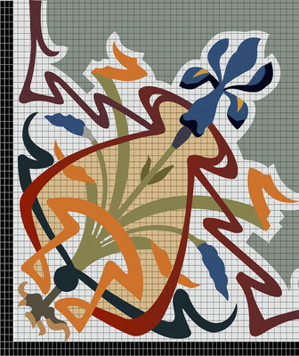 21/07/2025 - Mosaïque de la Villa Elie Derveaux à Cambrai. On est passé de l'art nouveau à l'art déco avec ses symétries. Je n'ai pas compté le nombre de tesselles numériques que j'ai calqué sur cette seule partie d'un des motifs de la mosaïque (dont la photo était suffisamment nette) ! Agrandir par clic. Le motif central, repris pour les coins, est ici dessiné sur un quadrillage n'ayant rien à voir avec des tesselles potentielles.