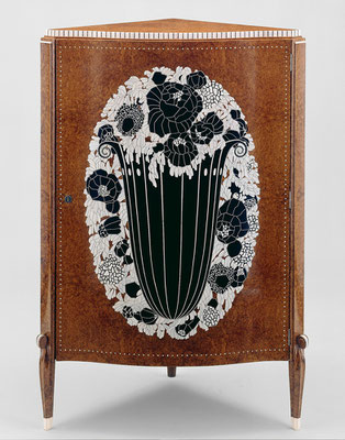 24-25/07/2025 - Transcription de "Cabinet d'angle", marqueterie de 1925, ivoire et ébène sur amboine (santal rouge) de Jacques Emile Ruhlman (1879-1933).