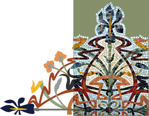 02/05/2025 - D'après une œuvre de Galileo Chini (1873-1956) représentative du Stile liberty (art nouveau italien). La séduction des roses et des perles contre celles de Bacchus ? La transcription en vectoriel du cadre en céramique vernissée était un bon challenge.