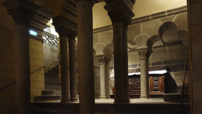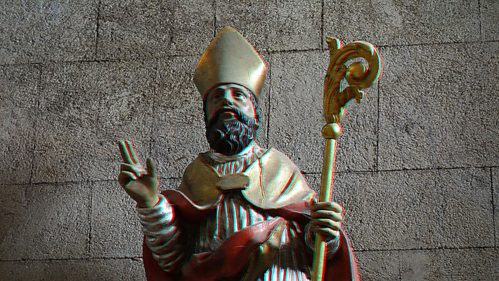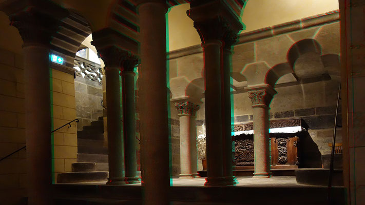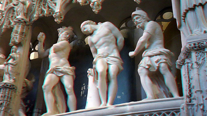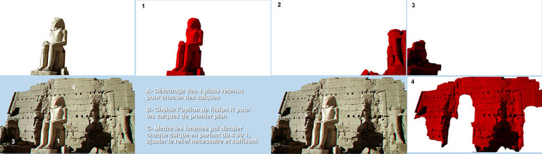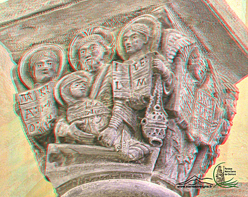 Pour des photos ayant des plans bien définis on peut largement améliorer le relief en détourant des portions de l'image et réaliser autant de couches (rouges) que de plans comme dans le cas ci-dessous (crypte de l'église ND du Port à Clermont-Fd).