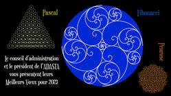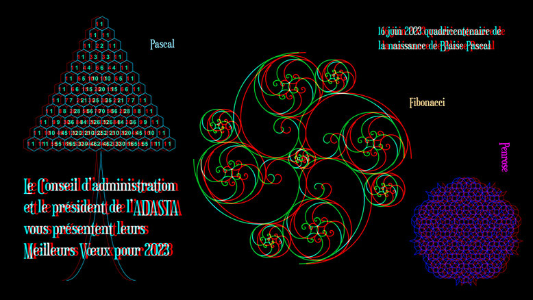 Le triangle de Blaise Pascal permet de retrouver les termes de la suite de Leonardo Fibonacci. Ces termes sont les rayons des quarts de cercles qui construisent la spirale d'or. Le dessin, réalisé sous illustrator, est une association de spirales d'or. Le troisième motif est un des pavages de Roger Penrose dont les éléments sont aussi dans les proportions du nombre d'or.